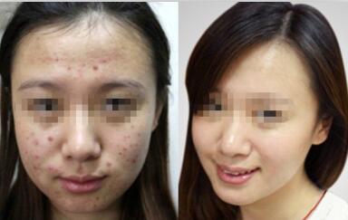 在第二阶段治疗后,该患者面部粉刺、脓疱都消失无踪,与治疗前比,就像是演员“玩变脸”,取得了理想的治疗效果,患者本人很满意。但因学业紧张,不能继续进行第三阶段的去痘坑治疗,只得暂时中止治疗,待有合适机会再来。