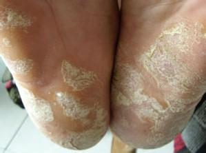 常发生于掌跖及其侧缘或足跟部。表现为皮肤角化过度、粗糙、脱屑、干裂,常在寒冷冬季易发。